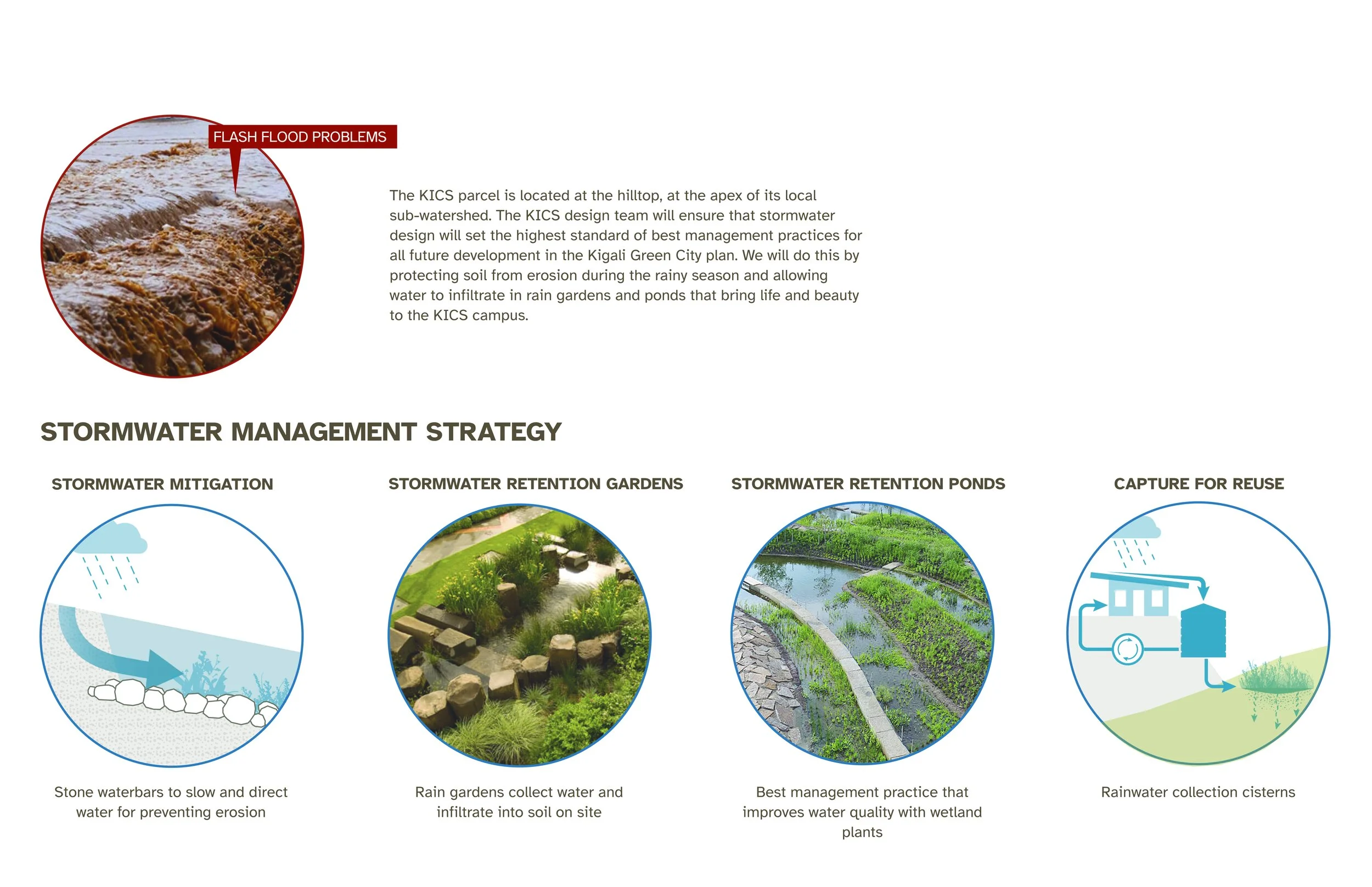 GAC led an interdisciplinary, multinational design team for the development of a 9-hectare K-12 school campus within the Kigali Green City, currently in the permitting stage. The project reflects a holistic, community-centered vision of education that integrates sustainability, local identity, and contemporary pedagogical practice. It embodies a sustainable design ethos through the integration of renewable energy systems, regionally sourced materials, and passive environmental strategies tailored to the equatorial climate. Construction methods prioritize low-carbon, locally appropriate techniques, including rammed earth, compressed earth blocks, and regionally fired bricks—materials chosen for their thermal mass, availability, and minimal embodied energy.